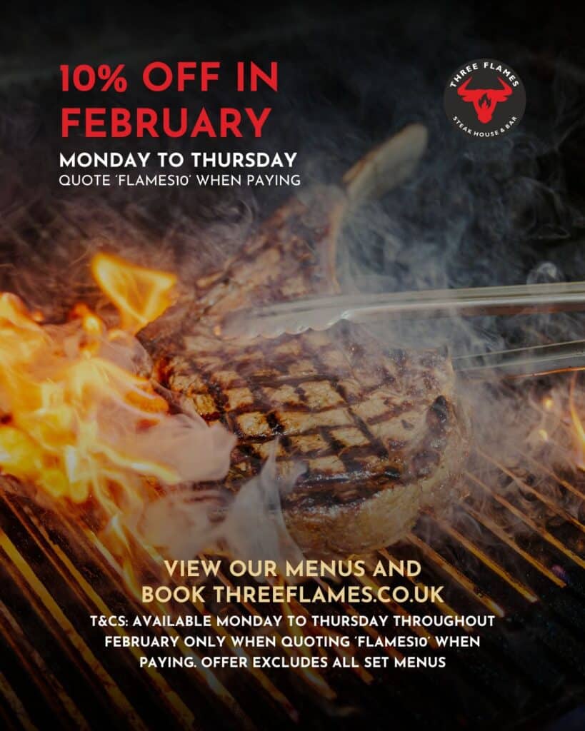 T&Cs: Available Monday to Thursday throughout February only when quoting ‘FLAMES10′ when paying. Offer excludes all set menus.